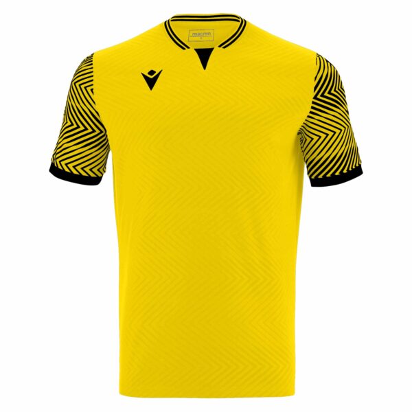 Maillot  jour du match, réalisé totalement en tissu Eco, 100% polyester recyclé à partir de PET. Le dos est en Eco micro mesh, qui apporte légèreté au vêtement et garantit le maximum d’aération. Des inserts en Ecomesh se trouvent devant et au dos du col, pour une évacuation optimale de la transpiration. Le devant du maillot est gaufré et sublimé en contraste sur les manches. Disponible en 14 assortiments de couleurs.
